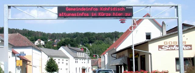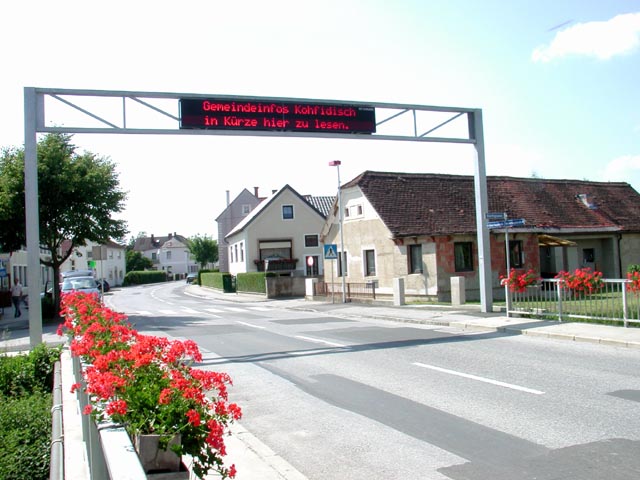 Die beiden „Rücken an Rücken“ montierten LED-Laufschriften sind absolut sonnenlichttauglich. Ein Lichtsensor mit 256 Stufen regelt die Helligkeit. Die Gemeinde Kohfidisch nutzt die LED-Laufschriften für Ortsnachrichten, Werbung und Verkehrsinformationen. Aktualisiert wird der Content der Laufschriften über DECT-Funk direkt vom Gemeindeamt aus.