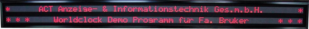 Die LED-Weltzeit-Uhr, welche ACT für die Firma Bruker AXS produziert hat, verfügt über die Funktion einer Weltzeituhr und kann gleichzeitig auch aktuelle Firmeninfos anzeigen. Mit einem DCF-Empfänger erhält die LED-Anzeige ihre Referenzzeit über die Frankfurter Atomuhr. Jede beliebige Stadt dieser Welt kann mit der entsprechenden Uhrzeit auf dieser LED-Anzeige angezeigt werden. Auch die Formatierung ist flexibel, ob Stadt und Zeit nebeneinander oder übereinander ist Geschmackssache, die LED-Weltzeit-Uhr von ACT kann beides.