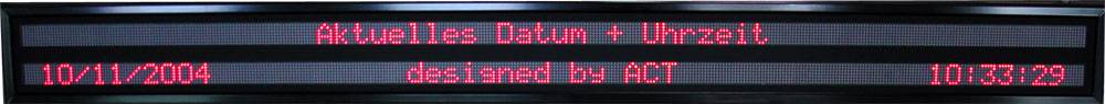 Diese Anzeige ist nicht nur eine LED-Weltzeit-Uhr, sie kann auch aktuelle News für Mitarbeiter und Gäste des Unternehmens anzeigen. Die Programmierung der LED-Anzeige ist einfach und rasch über die ebenfalls von ACT gelieferte Windows-Software möglich. Dies bedeutet einen deutlichen Mehrwert für diesen Displaytyp.