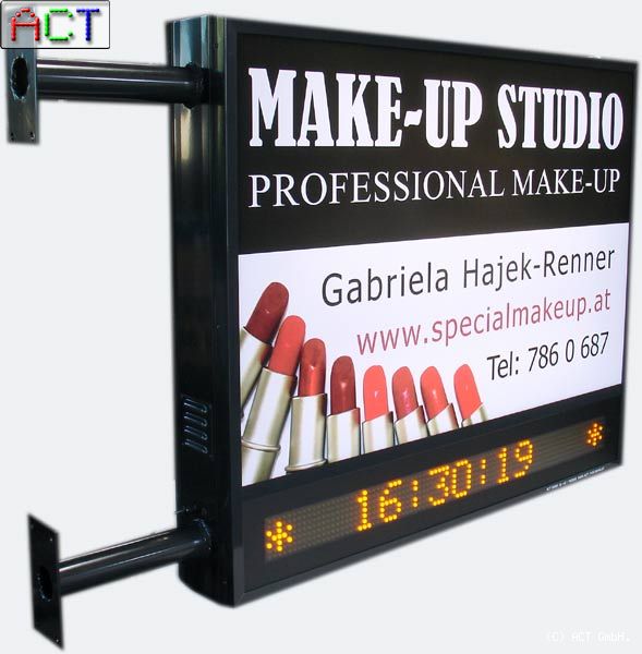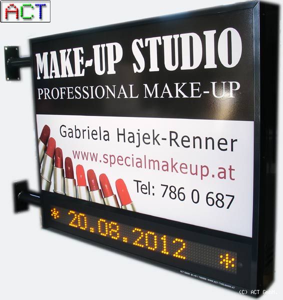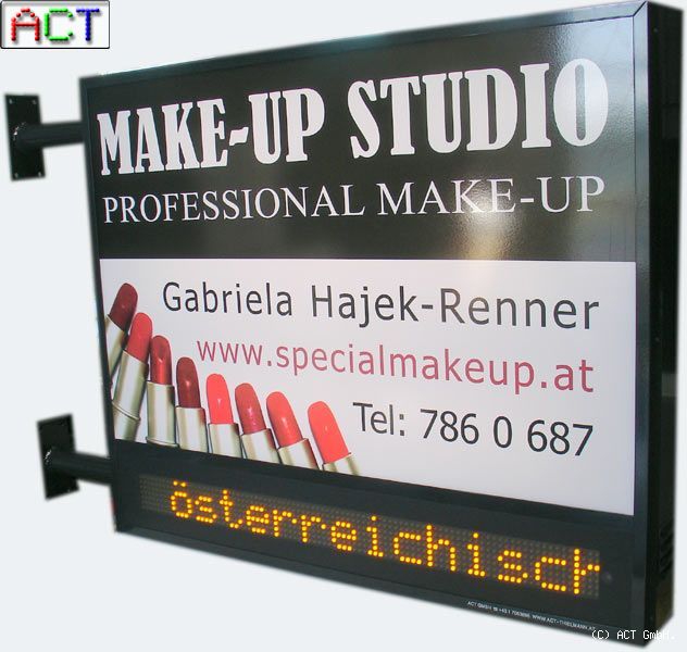 Für das Make-up-Studio Gabriela Hajek-Renner fertigte ACT ein Leuchtschild mit interierter LED-Laufschrift. Die Laufschrift ist mit gelben High-Quality AllnGaP II LEDs von HP (Agilent) bestückt und damit voll sonnenlichttauglich. Die Lichtstärke wird über einen Sensor automatisch in 256 Stufen je nach Umgebungshelligkeit eingestellt. Die Bedienung erfolgt mit einem PC. Die Daten werden mittels DECT-Funk zur LED-Laufschrift übertragen.