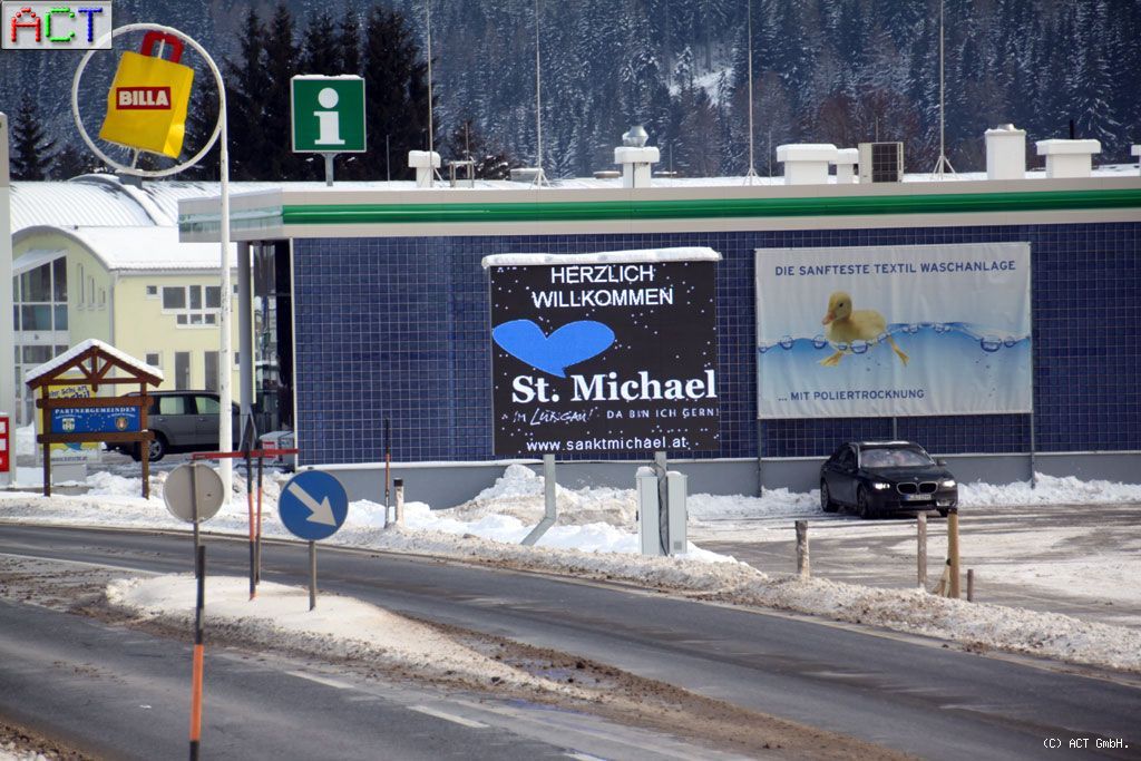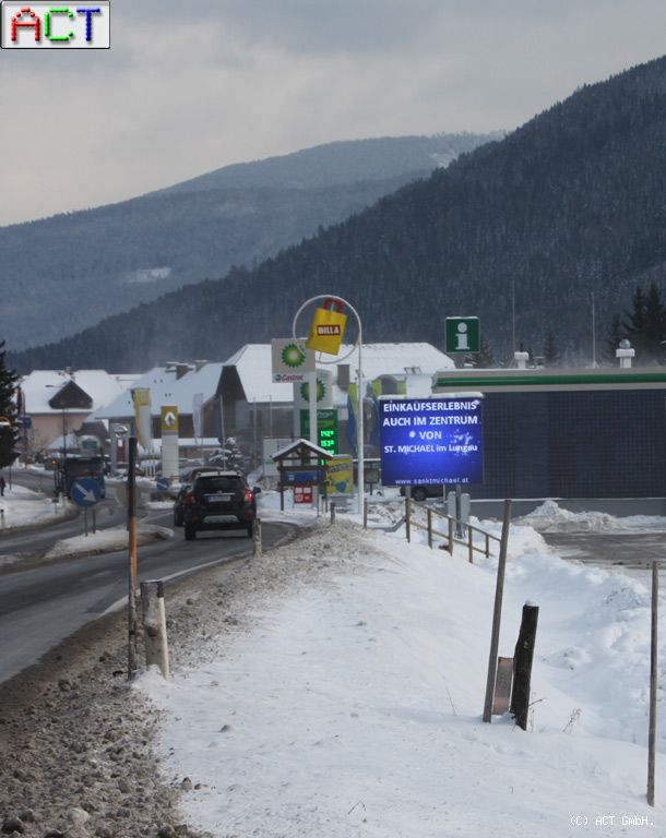 Die Gemeinde St. Michael und der Tourismusverband nutzen die LED-Grossanzeige an der Ortseinfahrt für Stadtmarketing und Informationen. Zielgruppe sind die Einwohner und Touristen gleichermaßen. Die Einspeisung der Daten erfolgt über den Tourismusverband, ein „gesunden Mix“ aus Werbung und Information sorgt für Aufmerksamkeit. Die Tourismusfachleute und Ortsverantwortlichen sind begeistert, da so rasch und einfach, quasi „auf Knopfdruck“ Passanten mit Neuigkeiten versorgt werden können. Gerade dieser Umstand macht eine LED-Grossanzeige im Außenbereich zum konkurrenzlosen Medium. ACT produziert LED-Videowände in unterschiedlichsten Größen und Ausführungen. Viele Gemeinden im In- und Ausland setzen auf modernes Stadtmarketing und vertrauen auf die Zuverlässigkeit der am Stadtrand von Wien produzierten Displays.
