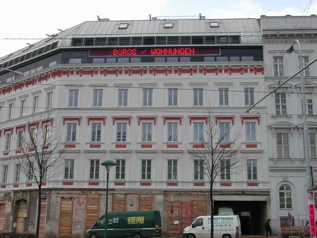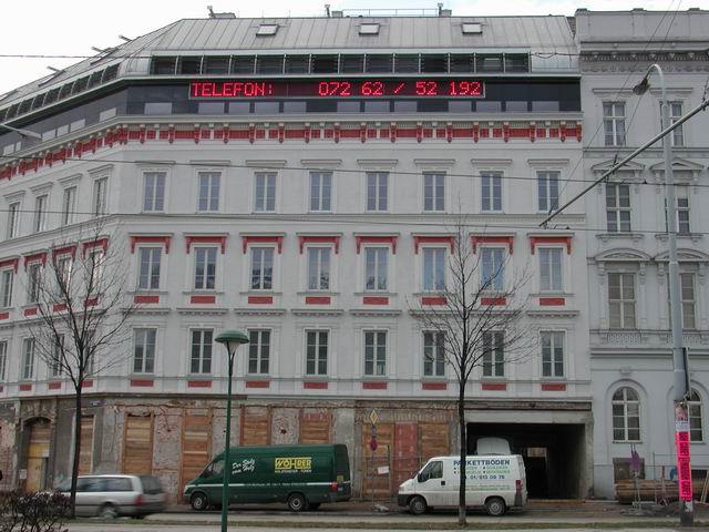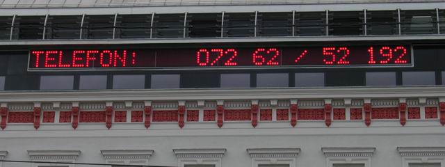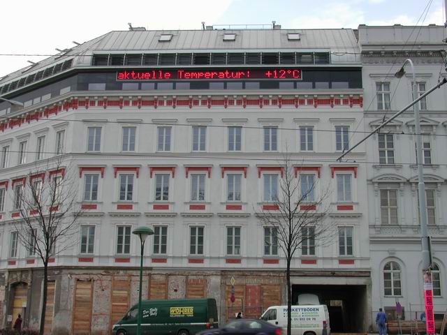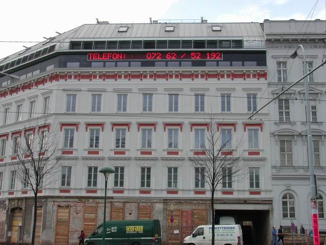 Die LED-Laufschrift ist am Gürtel, einer der stärkst befahrenen Straßen Wiens montiert. Sie zeigt zur inneren Mariahilferstraße, der bekannten Wiener Einkaufsstraße. Die enorm vielen Blickkontakte werten dieses LED-Werbelaufband entsprechend auf. Werbetexte können auch von Fremdfirmen hier gebucht werden.
