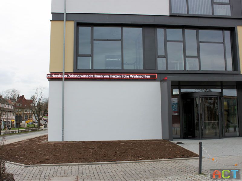 Auffällig um die Ecke gehender LED-Newsticker am neuen Verlagsgebäude der Hersfelder Zeitung