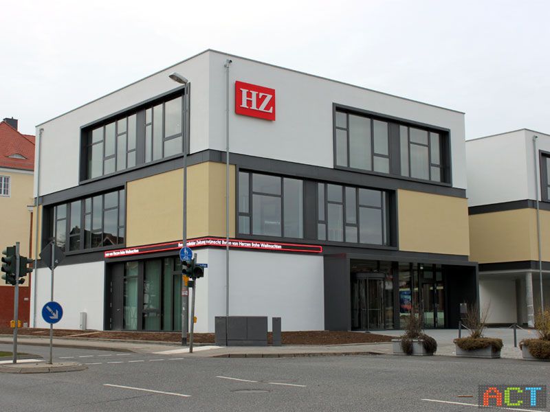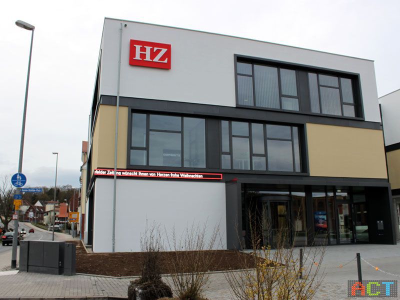 Das neue Sitz der Hersfelder Zeitung ist ein architektonisch sehr gelungener Komplex aus zwei Gebäuden. Direkt an der Straße, um die Ecke laufend wurde der LED-Newsticker positioniert. Hier sind die wichtigsten aktuellen Schlagzeilen zu lesen. Die Ansteuerung des LED-Videodisplays erfolgt online. Die Zeitungsredaktion wählt die Auswahl der aktuellen News aus, diese werden in Echtzeit am LED-Newsticker angezeigt.