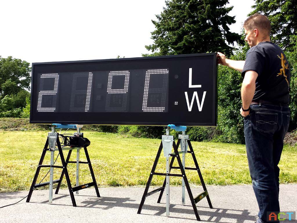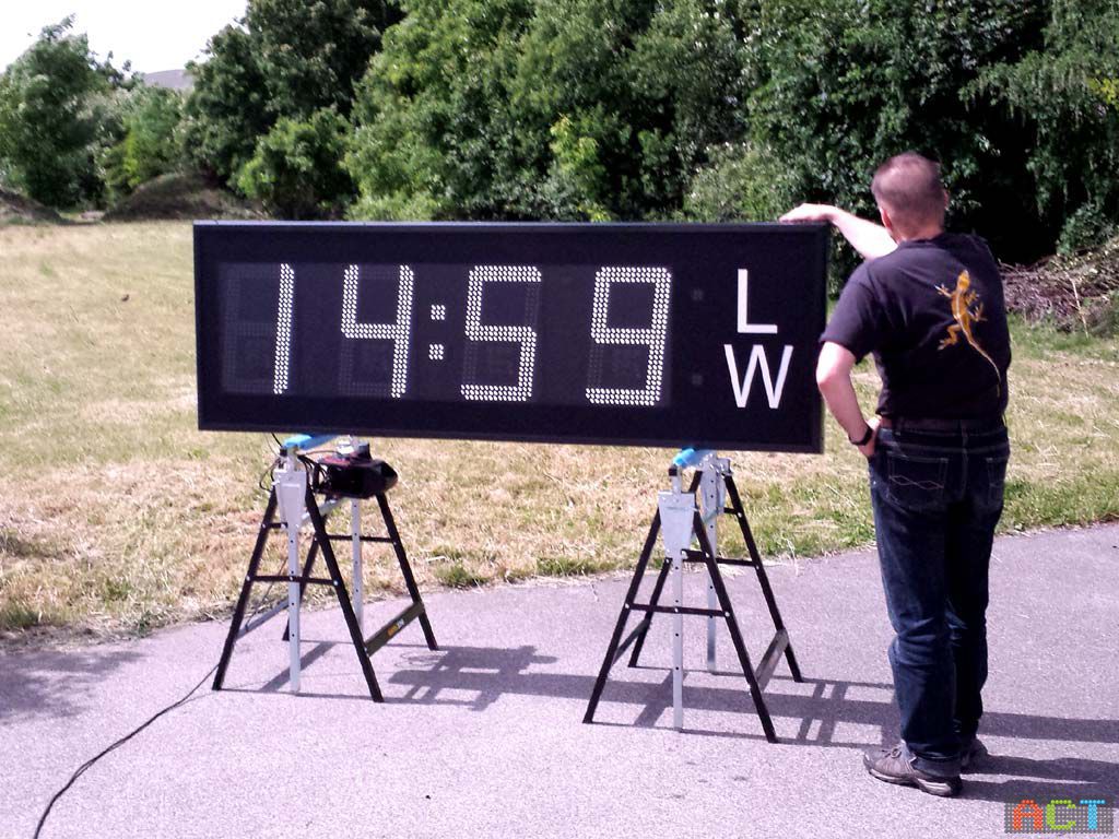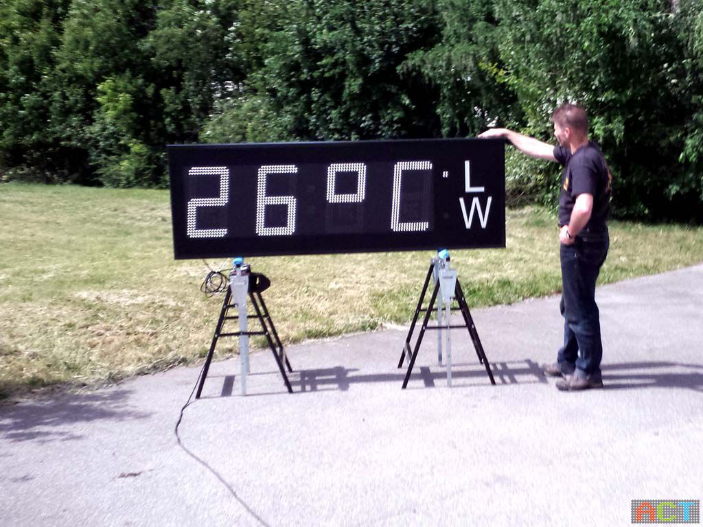 ACT produziert diese LED-Displays in ein- und doppelseitiger Ausführung. Die beliebtesten Ziffernhöhen sind 150mm, 200mm, 260mm, 310mm und 400mm. Lieferbar sind die LED-Anzeigen aber auch mit 1 m hohen Ziffern oder darüber. Ein leuchtender LED-Punkt zeigt an, welche Temperatur gerade angezeigt wird. Zeit, Luft- und Wassertemperatur LED-Anzeigen können bei ACT mit roten, gelben, grünen, blauen oder weißen Leuchtdioden bestellt werden.