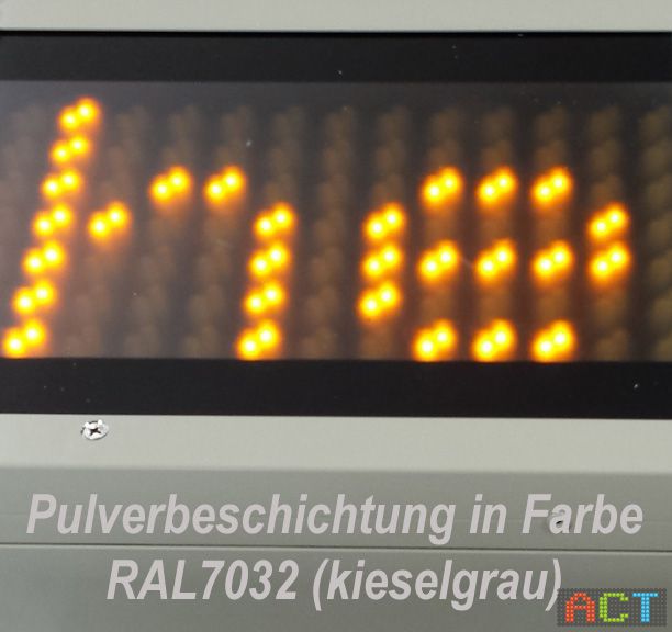 Nach Architektenvorgabe wurde das Gehäuse in RAL7032 pulverbeschichtet. Die bernsteinfarbenen LED´s passen ideal zu diesem Farbton. Die Leuchtdioden haben eine enorme Helligkeit, selbst bei direkter Sonnenlicht ist die gute Lesbarkeit immer gegeben.