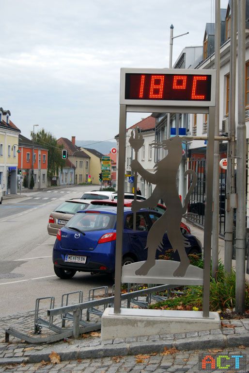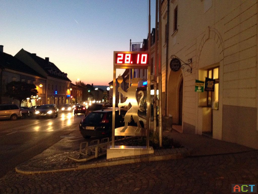 Oft sieht man Zeit/Temperatur-Anzeigen, welche utopisch hohe Temperaturen anzeigen, damit macht man sich lächerlich. Die LED-Zeitanzeige kann natürlich nur die Temperatur anzeigen, welche über den Fühler gemessen wird. Wird der Temperaturfühler von der Sonne angestrahlt, oder ist in der Nähe zu heißen Blechdächern montiert, oder bekommt die abstrahlende Hitze von Fensterflächen ab, ist klar, dass dann unsinnige Temperaturwerte auch auf dem LED-Display angezeigt werden. Aus diesem Grund hat die Gemeinde Loosdorf die LED-Zeitanzeige mit einem Funk-Temperaturfühler bei ACT bestellt. Hier kann dann der ideale Standort im Schatten im Umkreis von 30 Meter zur LED-Anzeige gefunden werden, eine einfache und flexible Lösung.