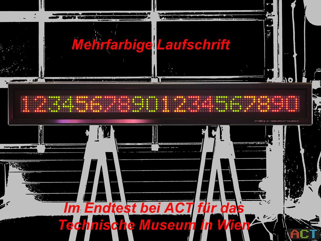 Das Technische Museum Wien zeigt Exponate und Modelle aus der Geschichte der Technik unter besonderer Berücksichtigung des österreichischen Anteils an der technologischen Entwicklung. Neu seit Oktober 2014 ist das von ACT produzierte LED-Anzeigedisplay, welches selbstverständlich nicht als Ausstellungsexponat dient sondern als Besucher-Informationsdisplay.