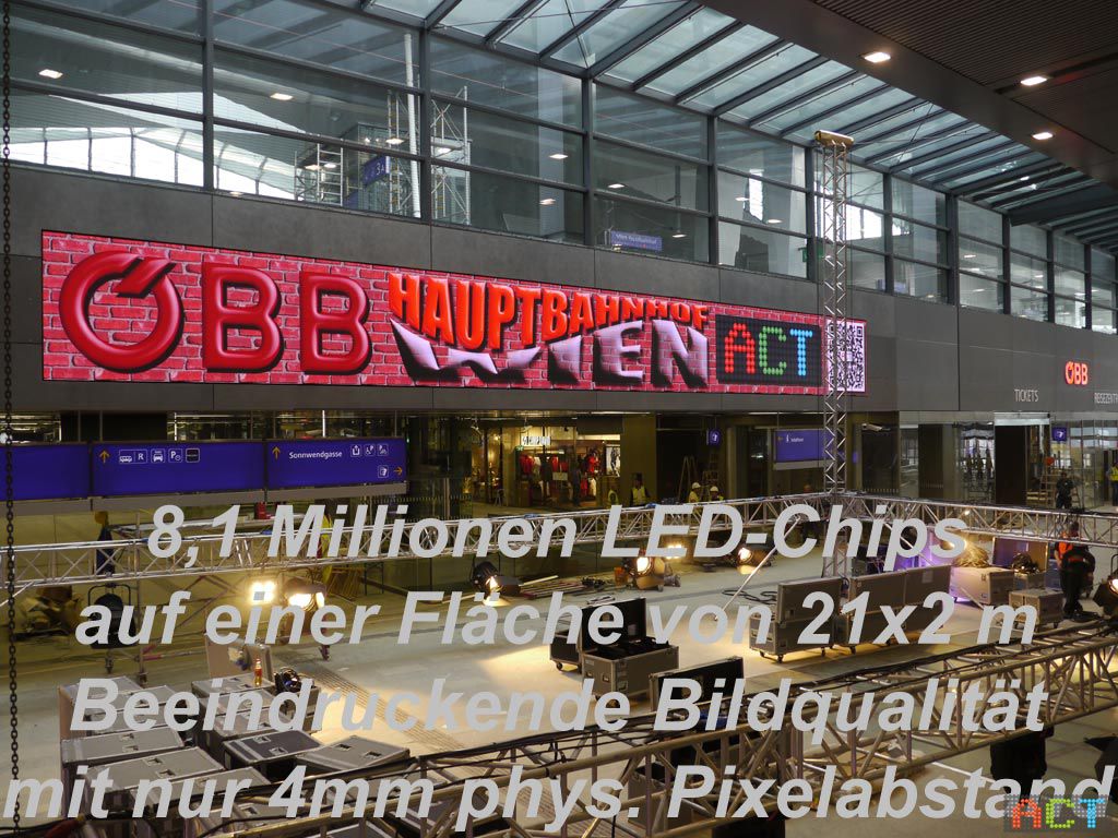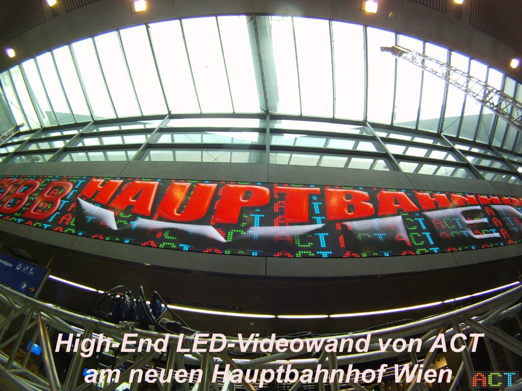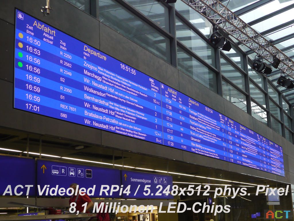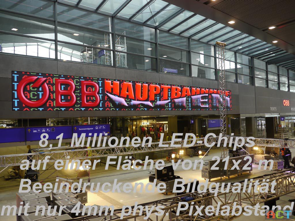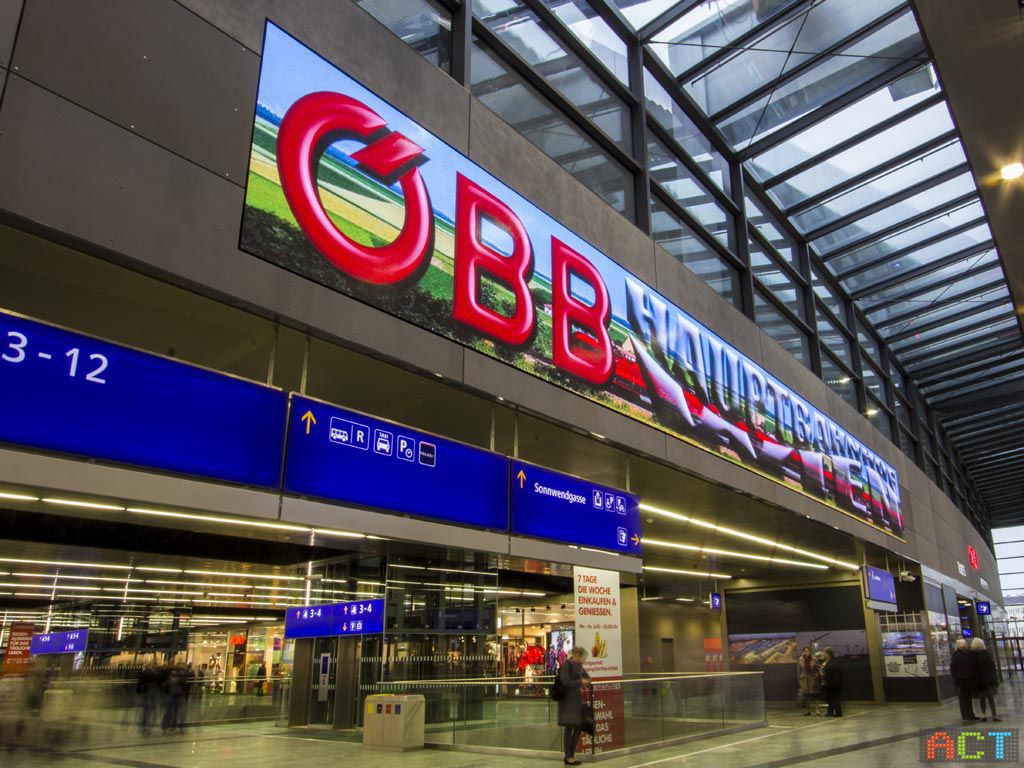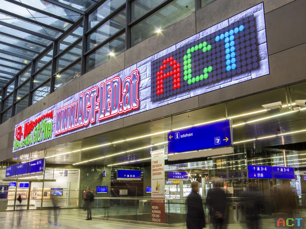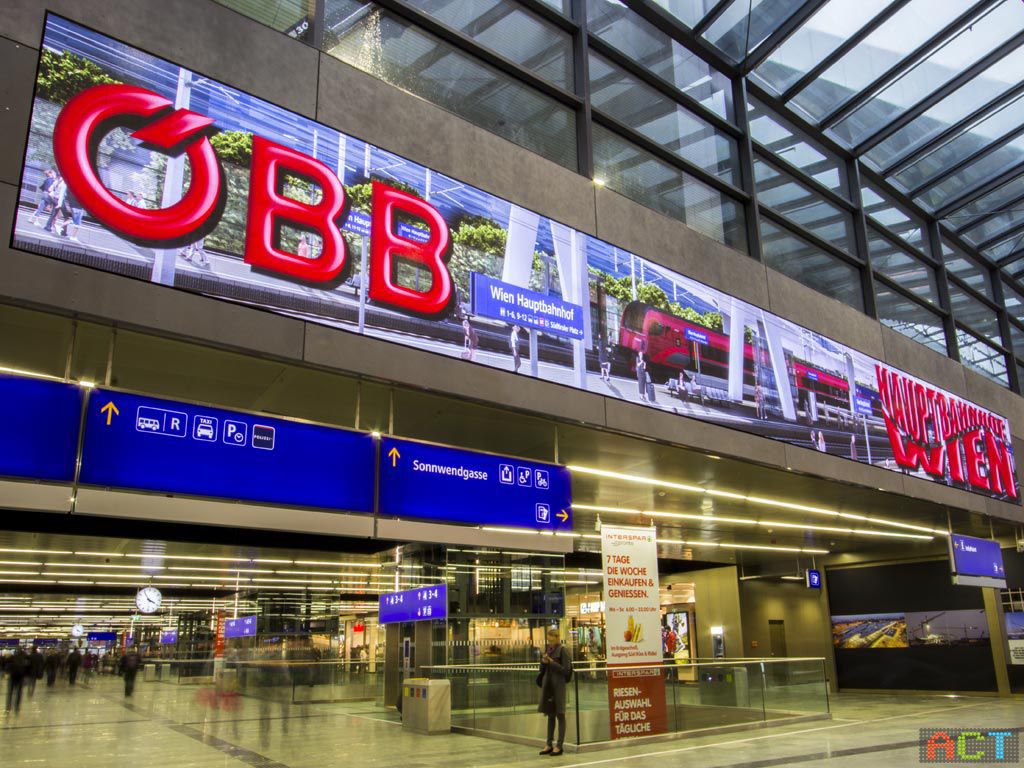 In den meisten europäischen Bahnhöfen werden die Fahrgäste noch mittels große LCD-Anzeigetafeln oder Faltblatt-Anzeigen über Zug An- und Abfahrten informiert. Die Österreichischen Bundesbahnen sind hier Vorreiter, für den neuen Hauptbahnhof Wien wurde hierfür in moderne LED-Technik investiert. Für die große Hauptanzeigetafel produzierte ACT als führender Hersteller in diesem Bereich einen LED-Screen in höchster Auflösung, welcher zentral in der Fahrgasthalle die Fahrgäste informieren wird.