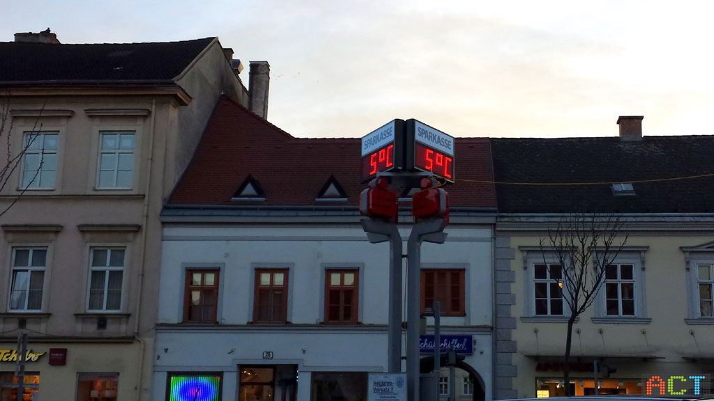 Die Ziffernhöhe beeinflusst die Größe des Displays und aus welchen Abstand die Uhrzeit-Temperatur-Anzeigen noch gut lesbar sind. Für die Sparkasse in Korneuburg wurde eine Schrifthöhe von 260 mm gewählt, was eine Lesbarkeit aus bis zu 130m garantiert. Perfekt für den Hauptplatz in Korneuburg.