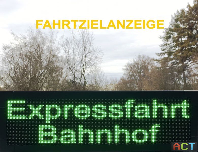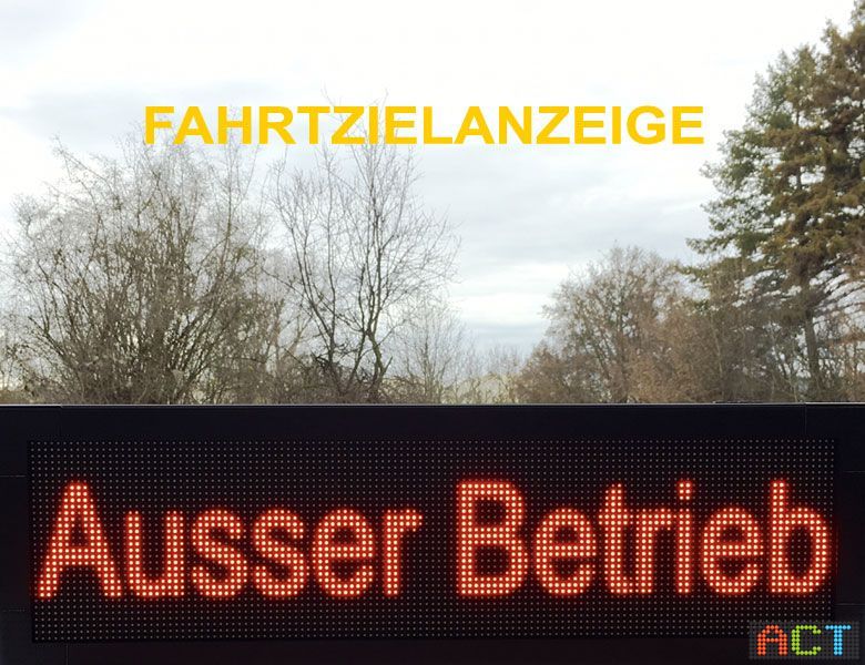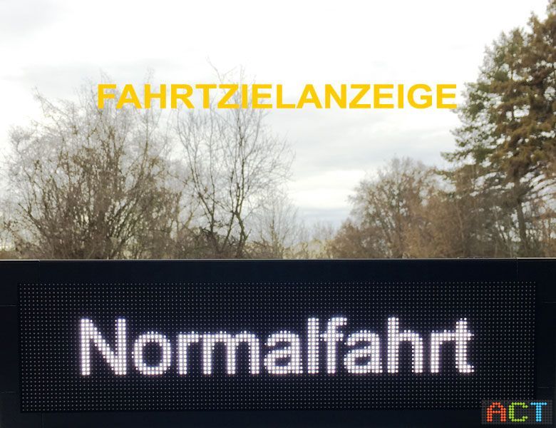 Eine Fahrtzielanzeige von ACT kann nicht nur statische oder blinkende Texte sondern auch Lauftexte, Grafiken, Animationen bis hin zu kleinen Videofiles darstellen. Wir liefern die Anzeigen zur „Plug and Play Installation“. Die LED-Displays werden von uns entsprechend den Kundenwünschen bereits fertig vorprogrammiert geliefert. Über potentialfreie Kontakte können dann die Fahrtziele ausgewählt und angezeigt werden.