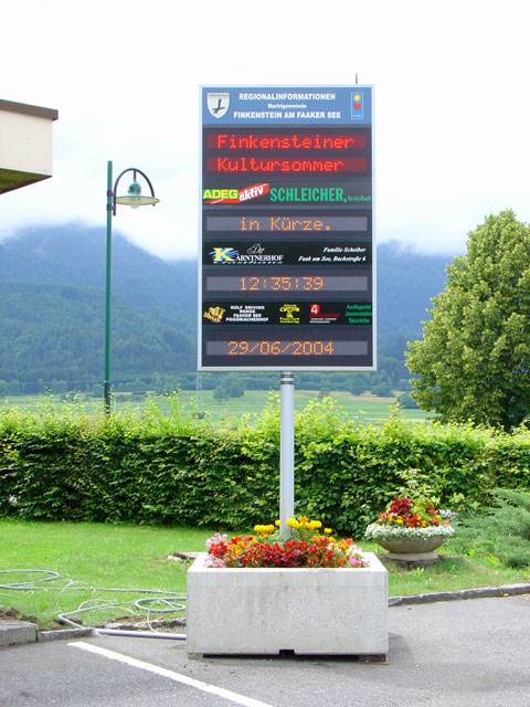 Die LED-Anzeigetafel von ACT für den City Info Point am Faaker See besitzt Logofelder, die mit Sonnenuntergang automatisch hinterleuchtet werden. Die Helligkeitssteuerung erfolgt automatisch in 256 Stufen. Ein eingebautes GSM-Funkmodem unterstützt die Textübertragung per Email vom Zentralserver der Tourismusinformation Faak zur LED-Anzeigetafel.