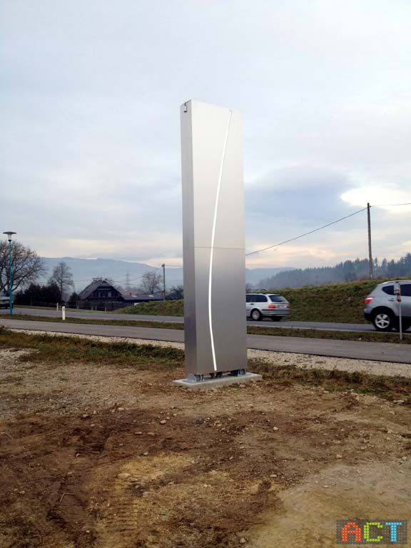 Die 4,6m hohe Infostele mit integrierter LED-Wand wurde nach dem Layout und Entwurf des Künstlers Armin Guerino errichtet. Die Infostele ist 4,6m hoch. Für die Led-Wand wurden LED-Pixelkarten mit SMD 3in1 Leds verwendet. In der Led-Videosäule ist ein Industriecontroller integriert. 16,7 Millionen Farben stehen für die Gestaltung schöner Werbespots und auffälliger Nachrichten zur Verfügung. Die Bildqualität auf dem LED-Screen ist hervorragend, auch bei Tag und direktem Sonnenlicht ist eine sehr gute Lesbarkeit gegeben. Natürlich wird abends die Helligkeit reduziert, dies erfolgt automatisch über einen integrierten Sensor, welcher ständig die Umgebungshelligkeit misst. Eine äußerst elegante LED-Info-Stele, die auf jeden Fall ihre Wirkung nicht verfehlt.