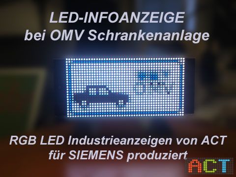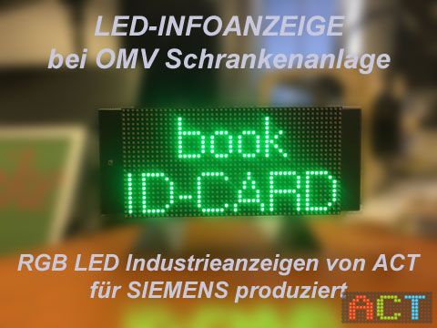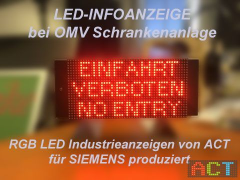 Die Zutrittsanlage von SIEMENS steuert auch die LED-Wechseltextanzeigen von ACT. Die ID-Karte und die KFZ-Karte wird vom System eingelesen, der LKW-Fahrer wird über die vollfarbigen LED-Anzeigen infomiert, was zu tun ist. Leicht verständlich wird so das Prozedere bei der Zufahrt über die Schrankenanlage erklärt. Die Ansteuerung der LED-Wechselanzeigen erfolgt über potantialfreie Kontakte, die Texte und Piktogramme sind in den LED-Anzeigen gespeichert.